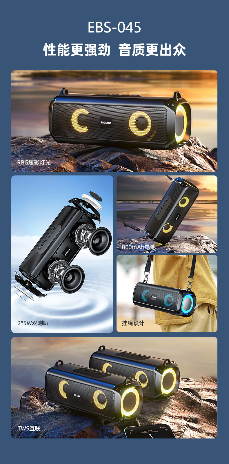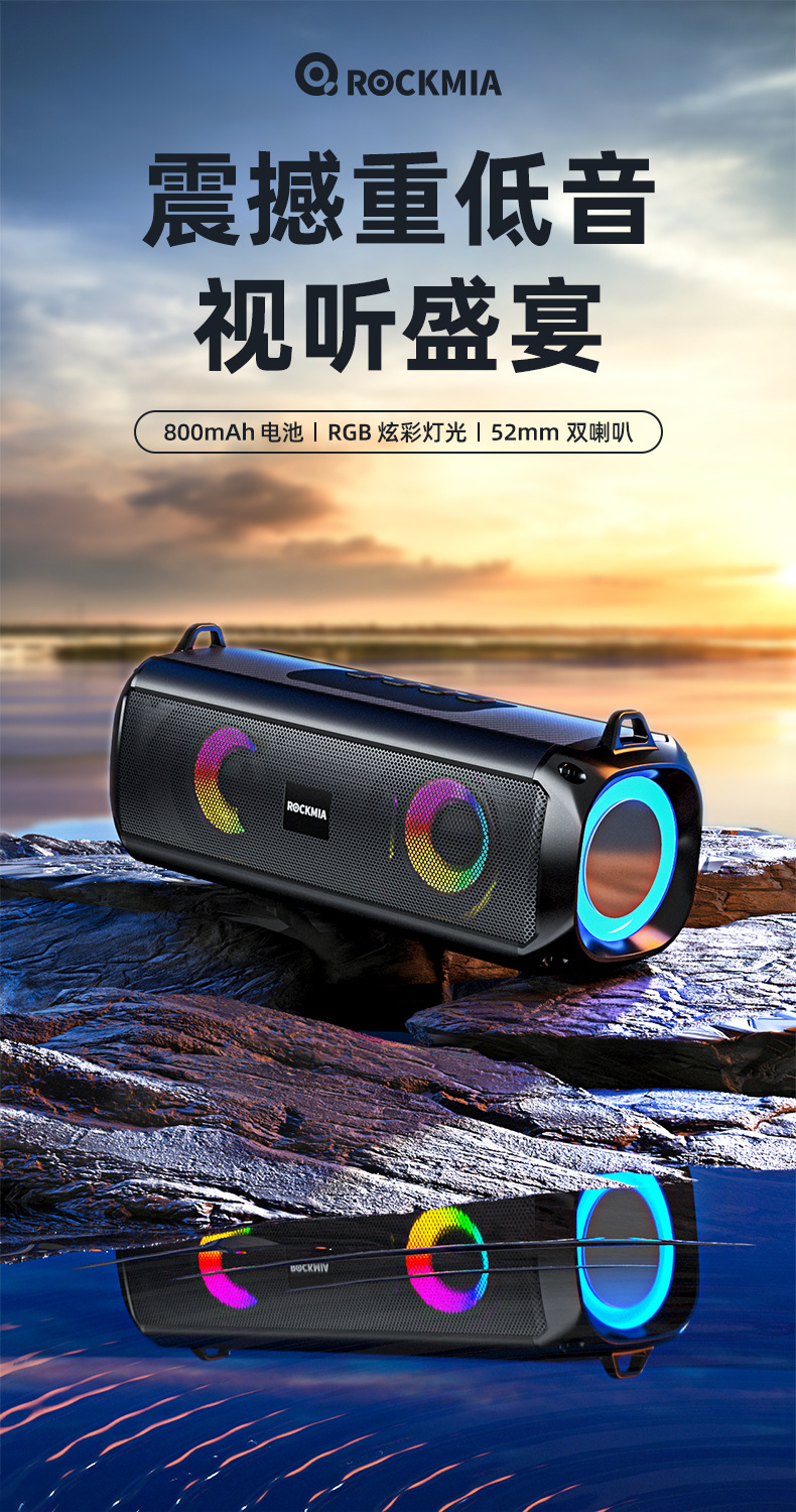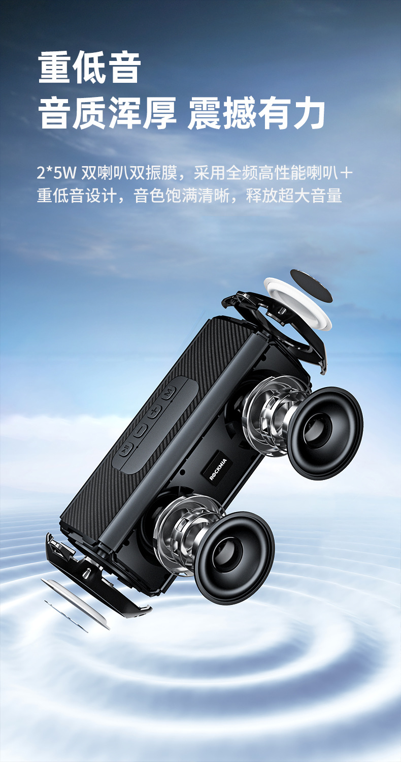 电源:可充电锂电池(800毫安时)输出功率:5W*2 无线:蓝牙5.0 音频输入:无线 工作距离:高达20米 工作时间:最多3小时 产品尺寸:200(长)*68(宽)*76(高)毫米 产品重量:476克
