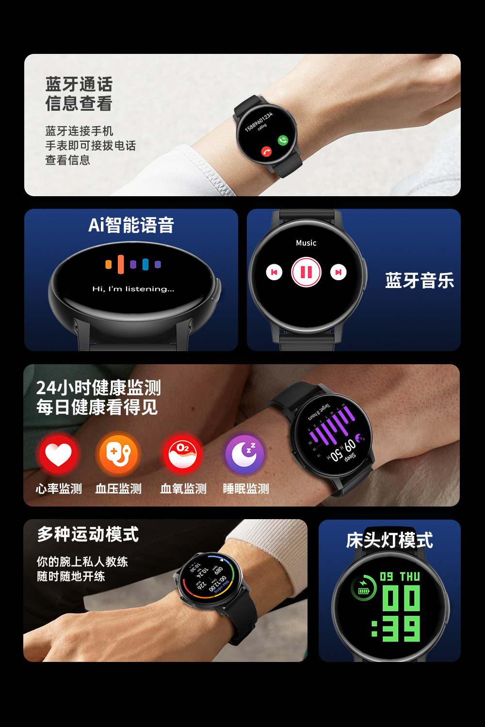 功能计步,心率监测,血压测量,蓝牙通话,智能提醒,遥控自拍,睡眠监测,血氧检测